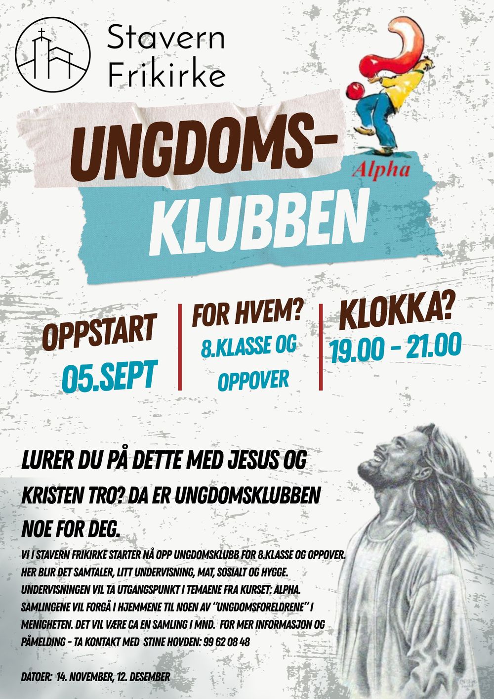 Nå starter vi opp alphaklubb for ungdommer! Det blir samtaler, litt undervisning, mat, sosialt og hygge. Samlingene foregår i hjemmene til noen av "ungdomsforeldrene" i menigheten. For mer info og påmelding: kontakt Stine Hovden, t: 99 62 08 48.